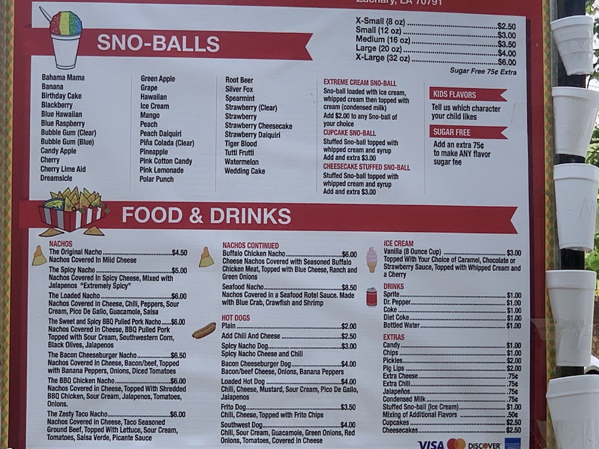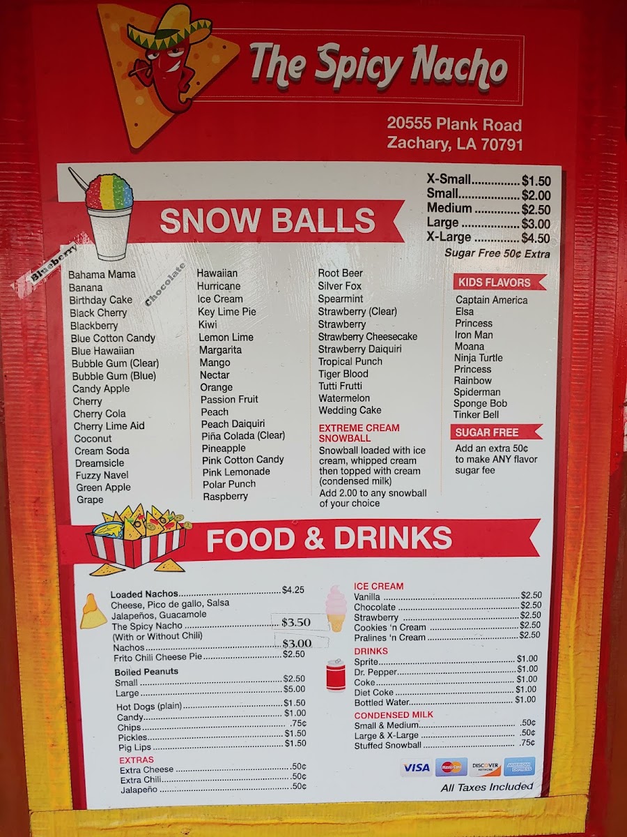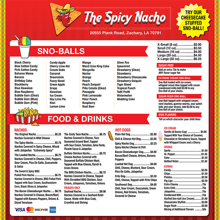 The Spicy Nacho Menu truly feels like a playful mix of comfort food and bold flavors, with plenty of variety to keep things interesting. The SNO-BALLS are available in multiple sizes, from the X-Small (8 oz) to the giant X-Large (32 oz), making them a refreshing choice for all appetites. Moving into the heart of the menu, the nachos are the star attraction. Options like The Original Nacho and The Spicy Nacho deliver the classics, while more creative choices such as The Loaded Nacho, The Sweet & Spicy BBQ Pulled Pork Nacho, and The Bacon Cheeseburger Nacho push the boundaries with inventive toppings. For something handheld, the hot dogs range from simple favorites like the Plain Hot Dog to indulgent versions like the Chili & Cheese Hot Dog, the fiery Spicy Nacho Dog, and the loaded-up Bacon Cheeseburger Dog or Loaded Hot Dog. For a sweet touch, the Vanilla (8 Ounce Cup) ice cream is a simple yet satisfying dessert option. To round out the experience, classic drinks like Sprite, Dr. Pepper, Coke, and Bottled Water keep things refreshing, while fun extras like Candy, Chips, Pickles, Pig Lips, and Extra Cheese give diners the chance to customize their meal or snack just the way they like it. Overall, the menu offers an energetic mix of comfort favorites and adventurous twists that make The Spicy Nacho stand out as more than just another snack spot.
